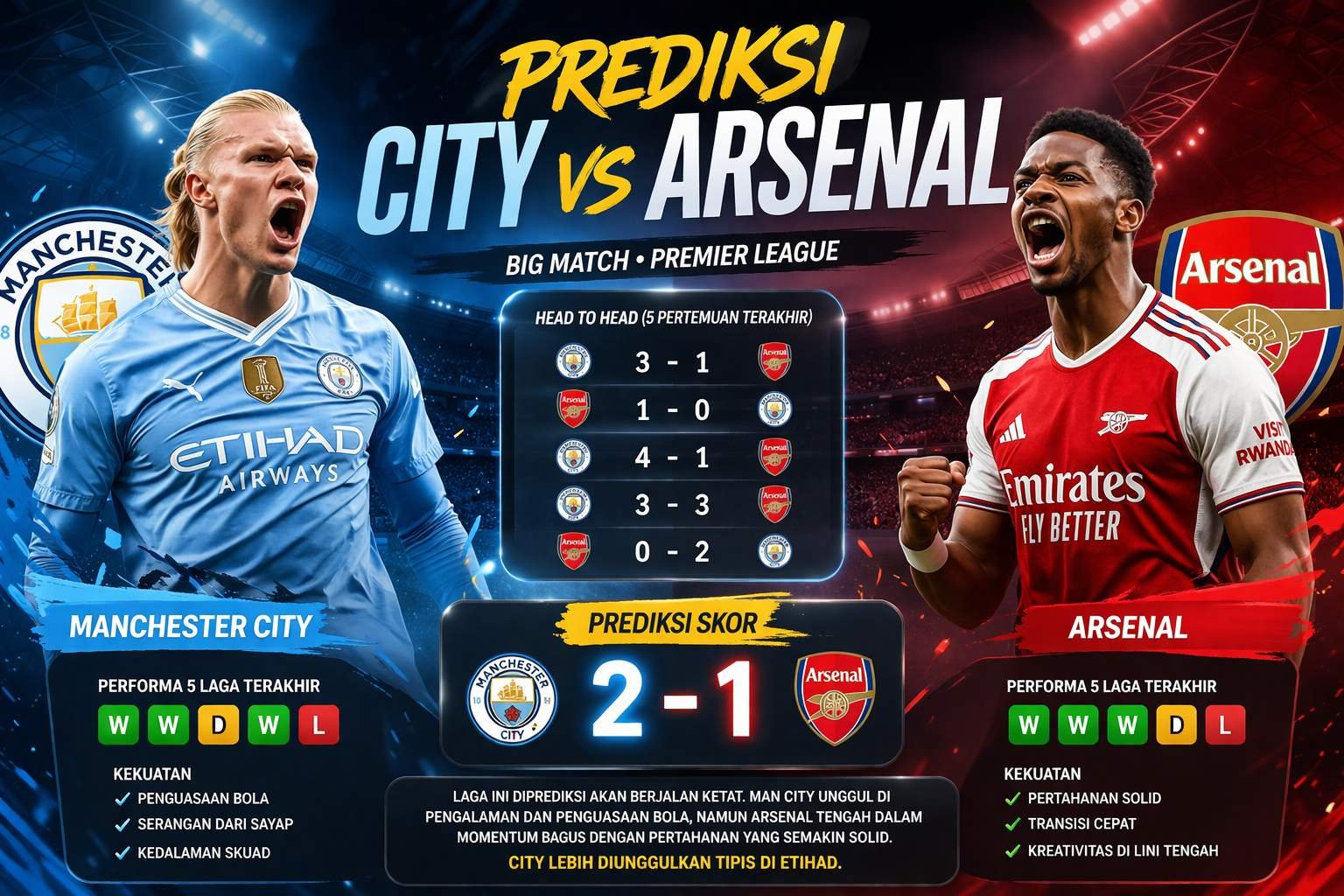 Berdasarkan analisis yang ada, prediksi skor City vs Arsenal adalah:
